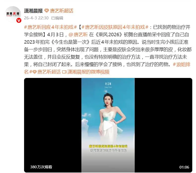 历经近四年的波折,唐艺昕最终通过心理上的自我调适,学会了接纳现状。与此同时,她也幸运地找到了能够控制病情的有效药物。随着皮肤问题趋于稳定,她重启事业的决心也愈发坚定。选择《乘风2026》的舞台作为回归起点,唐艺昕的坦言显得格外清醒而有力:“接纳自己就是自在乘风。” 这场乘风破浪,对她而言,远比舞台上的唱跳更为深刻。